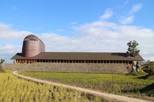 滋賀県近江八幡市にラ コリーナ近江八幡という人気施設があります。この施設は和菓子のたねやと洋菓子のクラブハリエを展開するたねやグループが、創業の地である滋賀県近江八幡市に35,000坪の敷地で展開する施設です。その本社の建物に銅板「はやぶき」が採用されています。基本設計は草屋根や手曲げ銅板で有名な東京大学名誉教授の藤森 照信氏で、クスノキの大木が屋根を貫通し、楕円形のドームが突き出す不思議な建物です。このドームも銅板葺きで、社長様や従業員様自らが加工した手曲げ銅板が使用されています。手曲げ銅板とは、切断した銅板に手加工で谷折り山折りを連続に加工し、上下左右のハゼもなく直止め重ね張りした工法です。藤森先生独特の工法で、ランダムに曲げられた銅板は工業製品と違い、味わいのある表情を醸し出しています。入口は屋根一面が芝に覆われたメインショップで、たねやの和菓子とクラブハリエのバームクーヘンが製造販売されています。メインショップを通過して内部に入ると左側に回廊、右側には写真の「銅屋根」の建物があります。中心部には田んぼがあり、不思議と懐かしさを感じる空間です。観光バスのコースにもなっており滋賀県の人気スポットです。近隣の方は是非一度行かれてみてはいかがでしょうか。ラ コリーナ近江八幡については弊社HPの施工例紹介にも掲載しております。ご興味のある方はご覧ください。