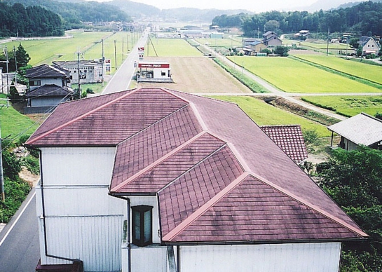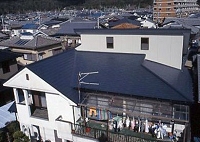 「はればれ」は化粧石綿スレート屋根の改修用の一文字葺きです。既設の屋根を撤去せずに施工するカバー工法で、アスベストを含んだ粉塵が近隣に飛散することを防ぎ、しかも住みながら改修も可能な工法です。