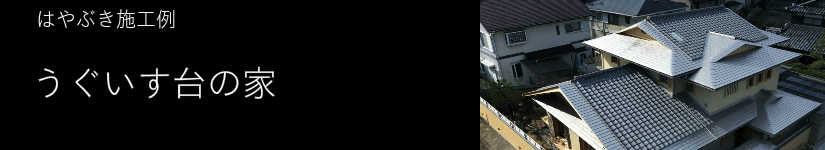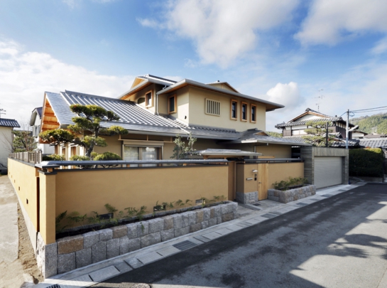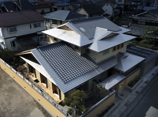 京都市郊外の閑静な住宅街に平成21年完成した「うぐいす台の家」に神戸製鋼所製純チタンKS40が採用されました。入母屋の屋根中央部は瓦葺きで、外周部に一文字葺き(はやぶき)が葺かれています。半永久的に腐食しないチタンの白銀色といぶし瓦の色調は、落ち着いた外観で調和しています