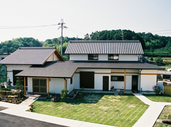 二世帯で同じ敷地に2棟建築された高取の家は、急勾配の2F大屋根は日本瓦で葺かれ、1Fの低勾配の屋根にシャダンルーフ20が採用されました。3重の防水対策で低勾配に対応し、室内も通気・断熱の効果により大変涼しく、お施主様にも大変喜んでいただいています