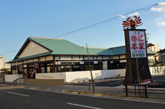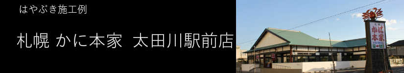 全国で本格的かに料理店を展開する札幌かに本家太田川駅前店が平成24年11月にオープンいたしました。この店舗の屋根約850㎡に弊社「はやぶき」が採用されました。緑青色の一文字葺きの屋根は駅前のランドマークとなっています。