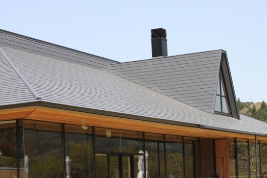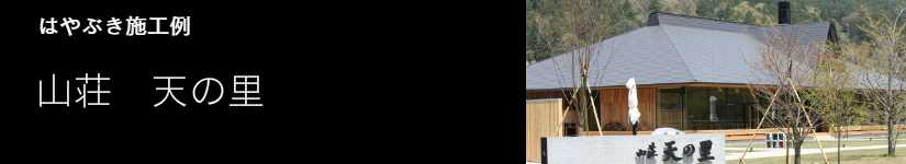 平成25年3月に和歌山県かつらぎ町の〝天野の里〟に宿泊&飲食施設「山荘 天の里 (あまのさと)」が完成し、本館の屋根に「はやぶき」が採用されました。高野山のふもと〝天野の里〟は世界遺産・丹生都比売(にゅうつひめ)神社がある自然豊かな地域で、この環境に調和するように建物はすべて平屋建てで設計されています