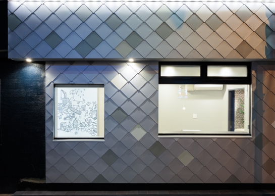 大阪市中央区にオープンしたアフロ動物病院の外壁に菱葺き303型が採用されました。古いビルを改装した店舗は大阪を東西に横断する長堀通りに面しており、カラーGL鋼板のシルバー系2色、ホワイト系2色を使用したランダム葺きで施工され、個性的な外観となっています。