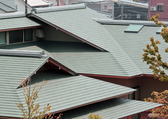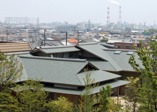 三重県四日市市の郊外に完成したS邸に耐摩カラー「はやぶき」が採用されました。木造平屋建ての屋根全面に葺かれた艶消しグリーン色の一文字葺きは周囲の植栽とも調和し、美しい屋根の日本建築が完成しました