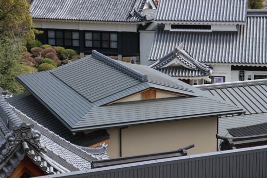 龍城神社(たつきじんじゃ)は、徳川家康公が生まれた岡崎城本丸に鎮座する神社で、家康公が戦乱の世を鎮め、天下統一をなし、万民和楽の大業を達成した偉業をたたえ、岡崎城内に奉祀されたものです。この度社務所および斎館が完成し、屋根にタフテンZ(亜鉛メッキSUS)「はやぶき」とスカイルーフ嵌合瓦棒が使用されました。