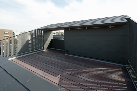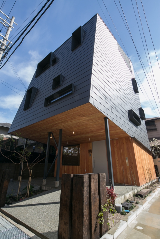 兵庫県西宮市の甲子園口に建設されたY邸はY's建築工房の所長のご自宅として建設されました。外壁正面の勾配面と他3面の幅を合わせるために特寸で製作いたしました。コーナー部はハゼ組によりきれいに施工されています。