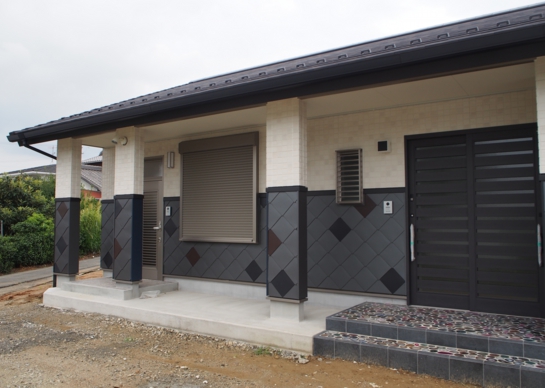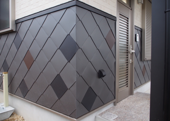愛知県豊田市で外装工事を営業している㈱リバイブス様の事務所及び社長のご自宅の外壁に菱葺きが採用されました。カラーGL鋼板3色のランダム葺きでギングロを主体にブラックとブラウンを混ぜて施工されています。社長自らが施工された個性的な意匠は外装工事の営業にも役立っています。