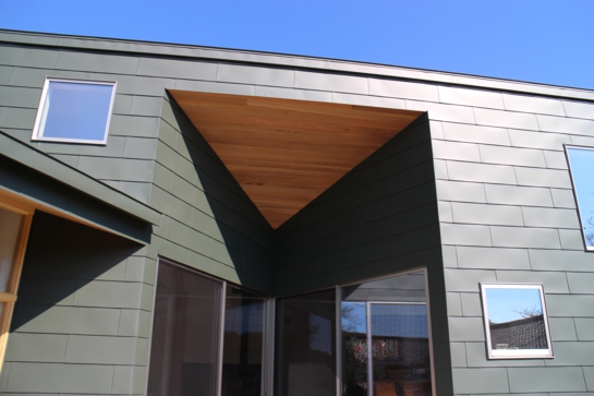 三重県桑名市に完成したT邸は外装材すべてがグリーンのカラーガルバリウム鋼板で施工され、緑豊かな敷地になじんでいます。コーナーが多いデザインで「かべいち」本体を廻し葺きで施工されており、美しい仕上がりとなっています。