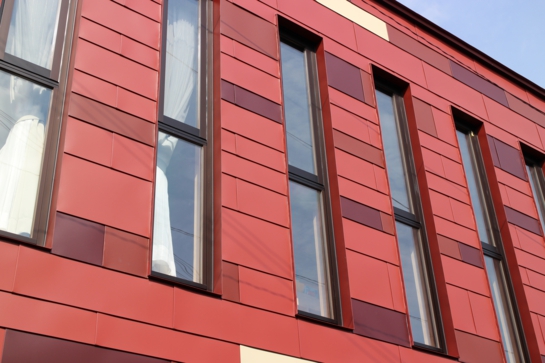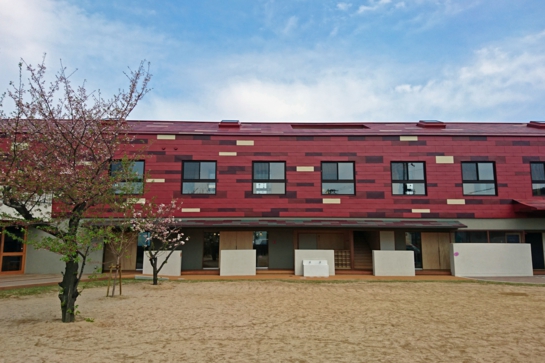 大阪府守口市に新築された金田こども園に「はやぶき」と「かべいち」が採用されました。屋根、壁共に4色ランダム葺きで特に壁は働き幅も3種類を組み合わせて特徴的な外観となっています。外壁はALCに通気層を設けて耐火野地板下地で、特にサッシ周りは美しい納まりとなっています。