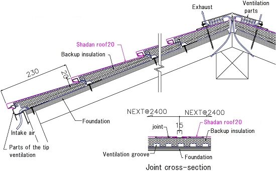 Air brought in through the intake of the roof-edge parts (aluminum extruding mold material) ventilates more natural air through the grooves in the heat-insulating material that serves as a support for the roof. This helps the roof foundation stay dry as well as preventing heat rises by constantly circulating hot air in the roof.