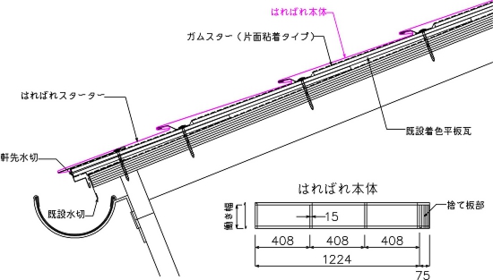 「はればれ」は化粧石綿スレート屋根の改修用の一文字葺きです。既設の屋根を撤去せずに施工するカバー工法で、アスベストを含んだ粉塵が近隣に飛散することを防ぎ、しかも住みながら改修も可能な工法です。