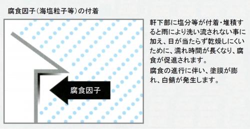 雨が直接かからない軒下は外装材の劣化防止に有効とみなされる場合が多いですが、鋼板の腐食に関しては不利に働きます。雨が当たらない部分に関しては定期的な水洗いなどのメンテナンスをお勧めいたします。