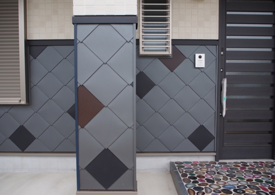 愛知県豊田市で外装工事を営業している㈱リバイブス様の事務所及び社長のご自宅の外壁に菱葺きが採用されました。カラーGL鋼板3色のランダム葺きでギングロを主体にブラックとブラウンを混ぜて施工されています。社長自らが施工された個性的な意匠は外装工事の営業にも役立っています。